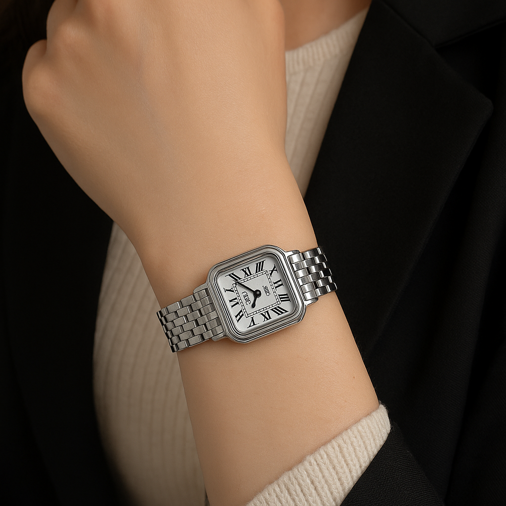 A timeless statement of elegance and precision. The Dua Watch features a refined square design powered by reliable quartz movement, ensuring both style and accuracy. Its fine steel band and steel case offer durability with a sleek, modern finish, while the 25mm dial with a slim 8mm thickness creates a graceful profile on the wrist.