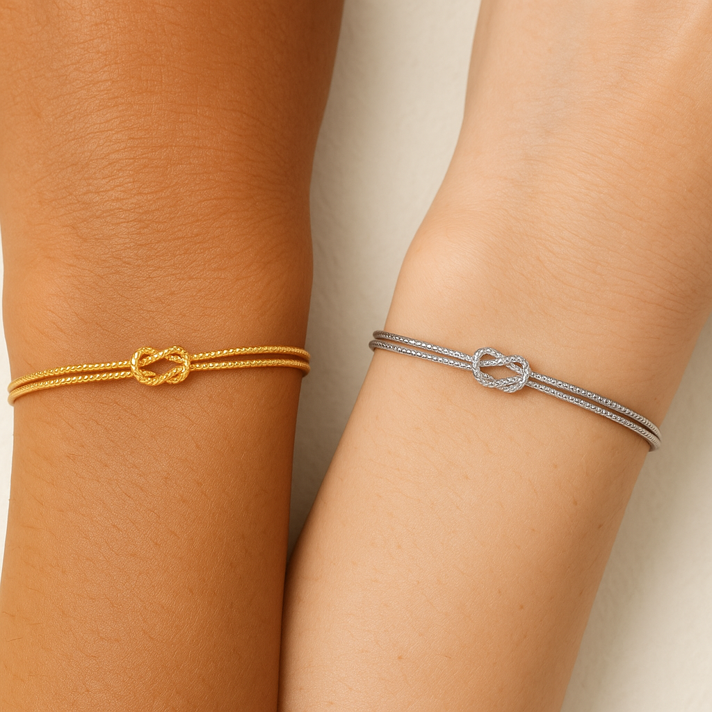 Symbolize your bond with the Amore Couple Bracelets. Featuring a refined knotted design in gold and silver tones, this elegant two-piece set is perfect for couples or close friends who want to carry a lasting reminder of their connection.