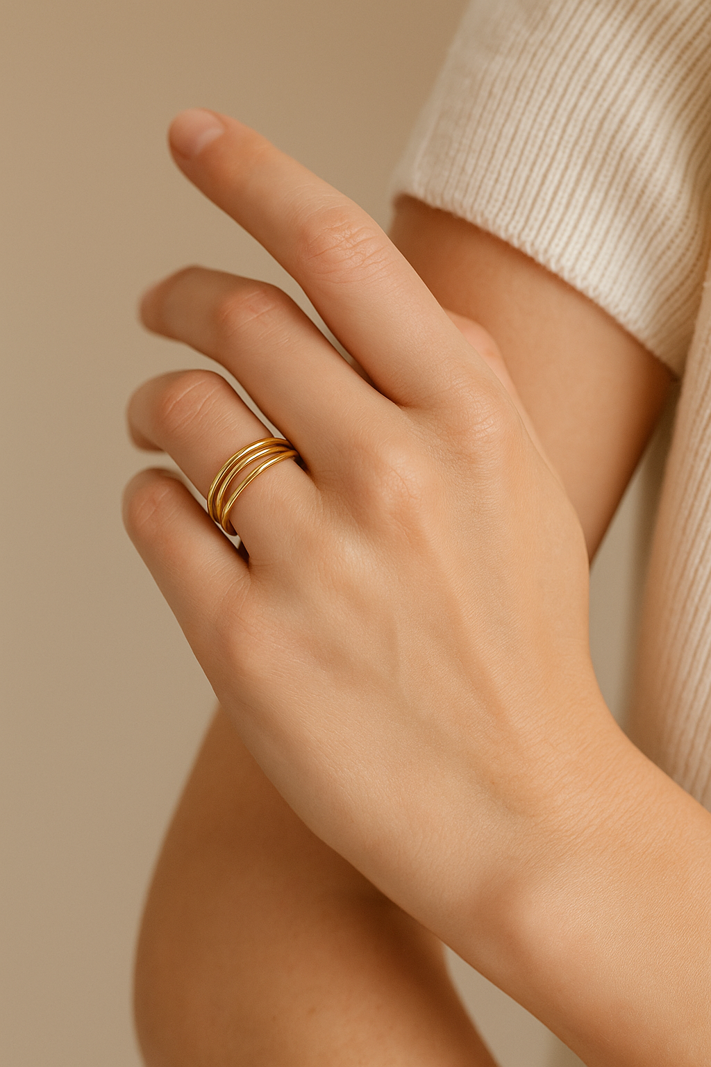 A timeless design that blends simplicity and elegance. Crafted in polished gold, the Isabel Ring is composed of three thin, harmonious bands that intertwine delicately, creating a refined play of light and reflections. Perfect to wear every day for a minimal chic touch or paired with other jewelry for a more sophisticated look.