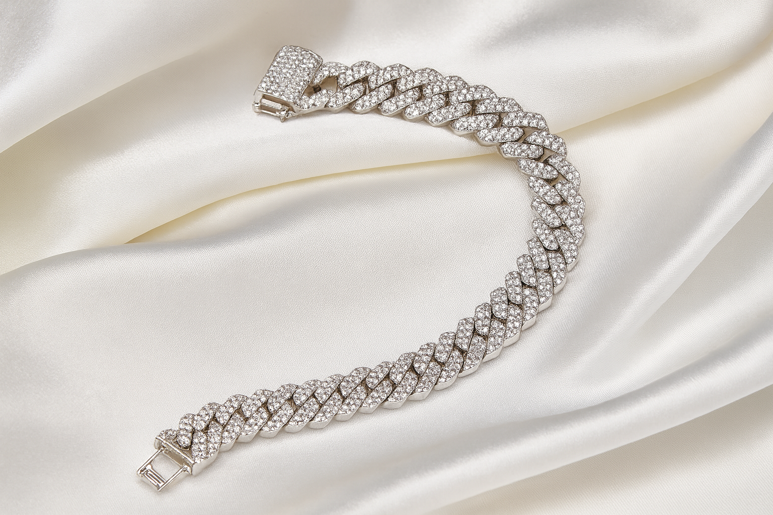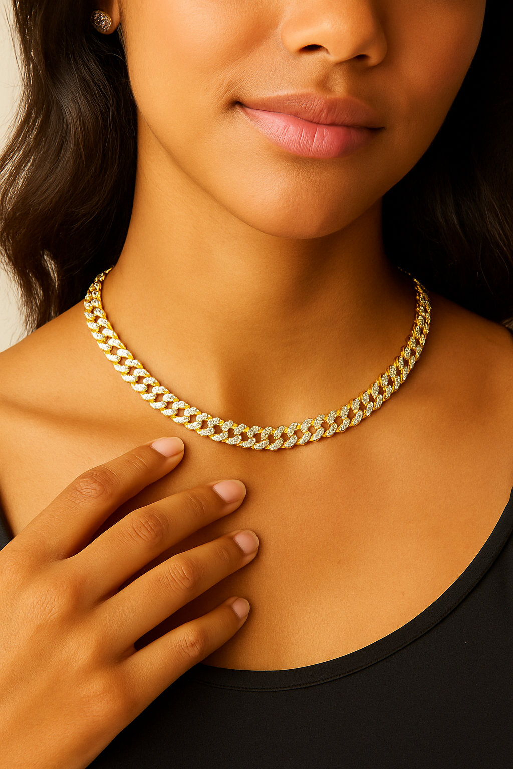 The Ivy Necklace is a bold statement of elegance and modern luxury. Designed with a classic Cuban link chain, each link is meticulously adorned with sparkling stones that catch the light from every angle. The golden finish enhances its brilliance, making it the perfect centerpiece for both casual chic and glamorous evening looks.